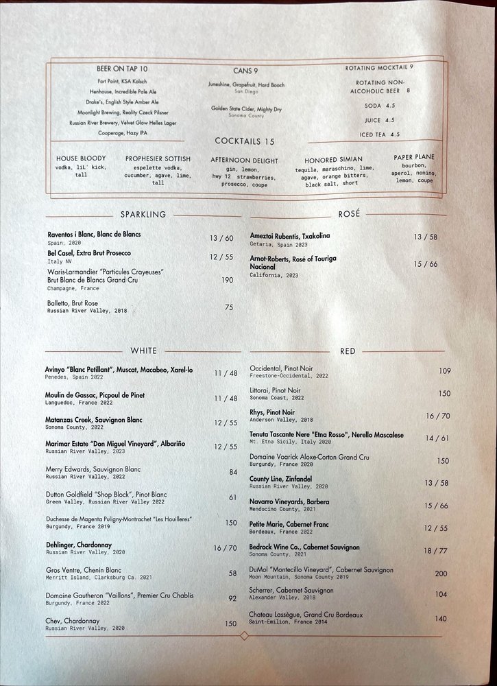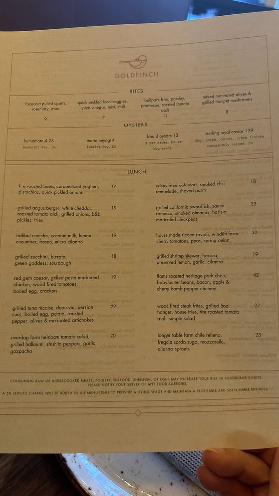 Introducing the menu at Goldfinch, a delightful seafood haven located in Sebastopol, CA. Known for its whimsical atmosphere and a menu brimming with fresh, innovative dishes, Goldfinch is perfect for any occasion—from casual dinners to romantic date nights. Diners rave about their exquisite calamari, which consistently tops the list of favorites, while the Dungeness crab raviolo and beet salad shine as standout entrees that marry flavor and presentation beautifully.